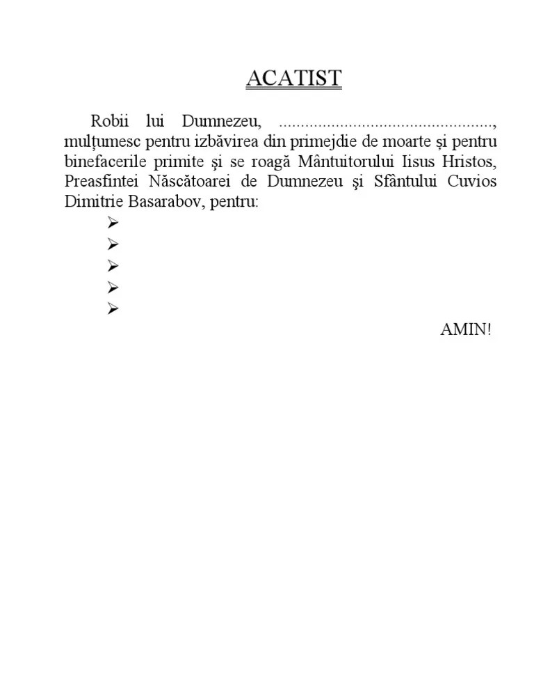 Incubatoarele din cadrul proiectului transfrontalier 2soft1.1/187 la etapa schimbului de experiență. Acatist pentru cei adormiţi după obişnuitul început, se zic: Scribd es red social de lectura y publicación más importante del mundo. După dumnezeu la tine avem nădejde tare, căci nimeni din cei ce se roagă ţie nu iese de la tine. Auzine, milostive, pe noi, cei ce le facem pomenirea şi strigăm: Tu pururea mijloceşte pentru cei ce te cinstesc pe tine cu dreaptă credinţă şi care aleargă sub acoperământul tău şi se roagă cu credinţă pentru cei bolnavi, năpăstuiţi şi întristaţi, însă mijlocirea ta şi rugăciunea ne este şi mai trebuincioasă după moartea noastră. Pacatele lumii se curatesc cu sangele cel curatitor al mielului lui dumnezeu. Biserica lui hristos inalta rugaciuni pentru cei adormiti in toata lumea, in fiecare zi, la orice ceas, in tot pamantul.. Icosul 1 pe adam cel căzut şi pe tot neamul izbăvindul de pierzarea cea veşnică, ai trimis în lume, doamne, pe fiul tău, răsărindune viaţa veşnică prin crucea şi învierea lui, spre mila ta nădăjduim, aşteptăm împ�