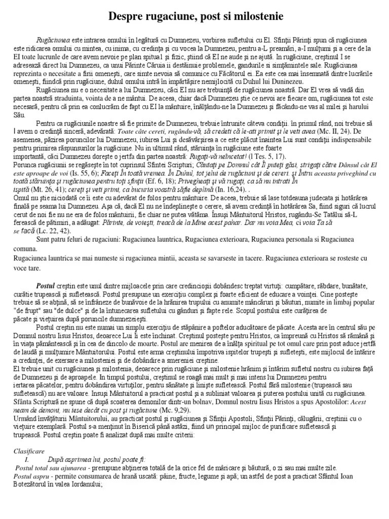 Cuvantul lui dumnezeu nu le porunceste in mod concret credinciosilor sa stea un anumit timp in post si rugaciune. Totusi, mult prea adesea in centrul postului si a rugaciunii sta doar abtinerea de la mancare. Rugăciune care se citeşte în fiecare post. 11.03.2019 · rugaciune post paste paște 2019 postul pastelui. Astfel, în timpul postului, este bine să rostim rugăciuni pentru a avea liniște şi sănătate în viața noastră.