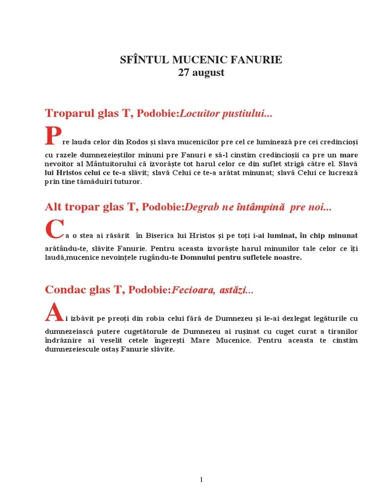 18.03.2010 · avea o troiţă cu hramul sf. Poporul cel credincios cunoscând mulţimea minunilor tale, pr Mai stiam ca atunci cand faci acatistul sfantului fanurie, tii si post, cele 9 zile. 9 zile la rînd se citeşte acatistul sfîntului şi în fiecare din cele nouă zile se dă de pomană la un om sărman, o plăcintă... Inapoi la pagina de discutii.