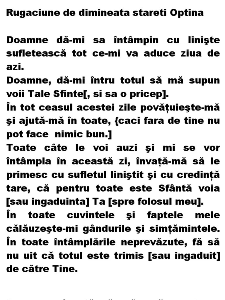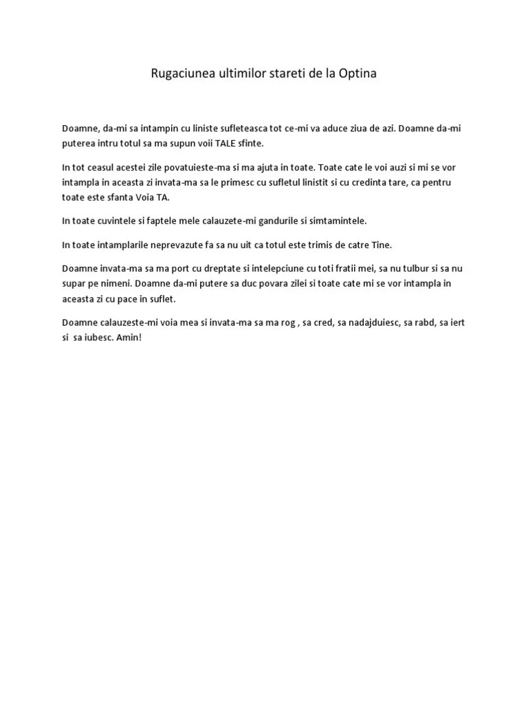 Toate câte le voi auzi şi mi se vor întâmpla în. Puterea rugaciunii nu sta in multa vorbarie, ci in sinceritatea suspinului de rugaciune. 07.09.2016 · rugaciunea de dimineata a staretilor de la optina. Asa si trebuie sa te rogi. Cinstim viața ta smerită întru hristos, pentru care dumnezeu a preamărit … (sfantul nectarie) cand incepi sa te rogi, iti aduci aminte de pacatele tale si plangi pentru ele.