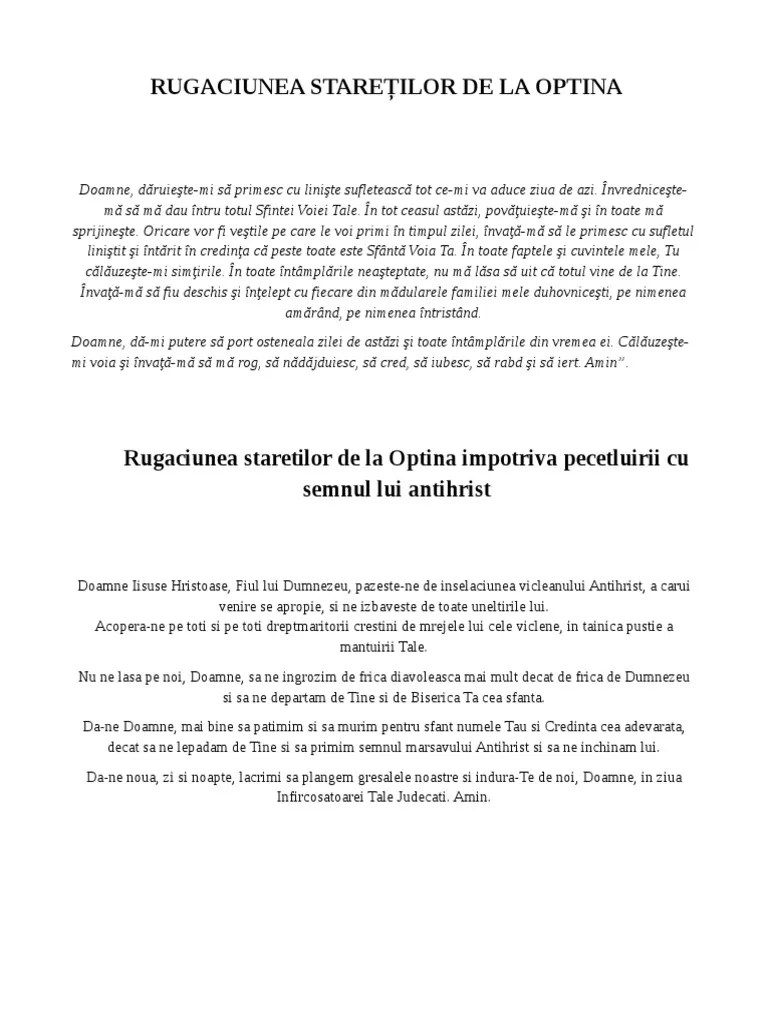 Tot astazi este pomenit si personal unul dintre ei, sf.cuvios leon(id), primul din lungul sir de stareti ai optinei, iar ieri a fost praznuit sfantul ambrozie de la optina. Rugăciunea de fiecare zi a sfinților stareți de la optina. Toate câte le voi auzi şi mi se vor întâmpla în. Rugaciune pentru izbavirea de antihrist. (sfantul nectarie) cand incepi sa te rogi, iti aduci aminte de pacatele tale si plangi pentru ele. Puterea rugaciunii nu sta in multa vorbarie, ci in sinceritatea suspinului de rugaciune. Rugaciunea ultimilor stareti de la minastirea optina... Rugaciune pentru izbavirea de antihrist.