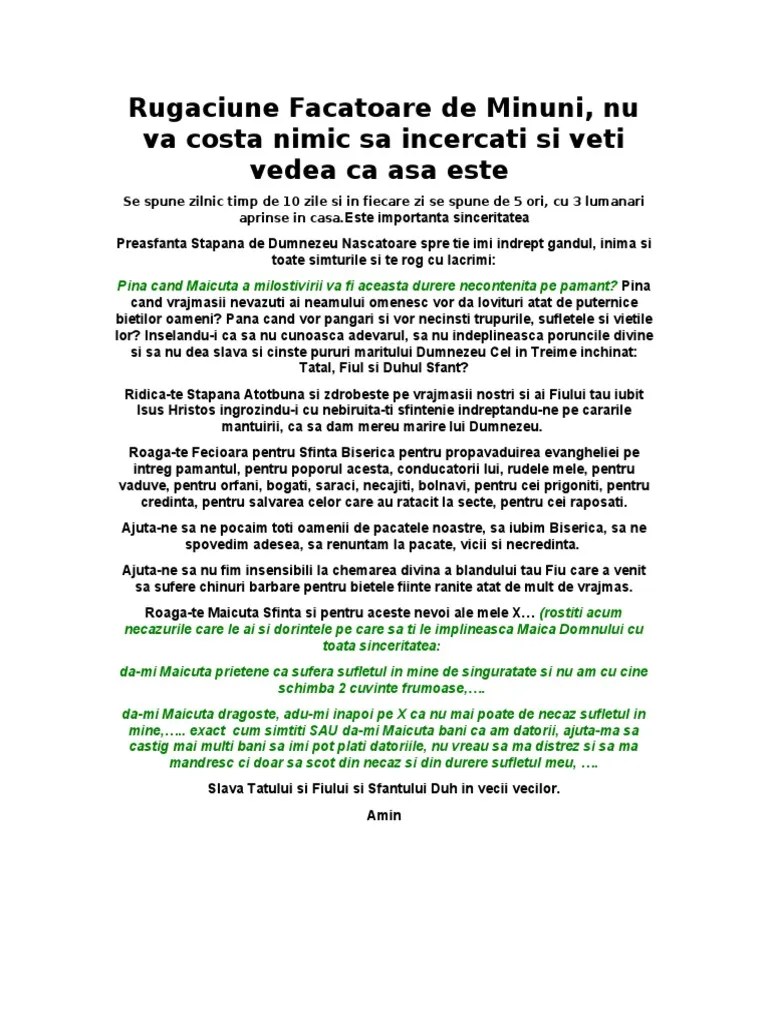 Rugăciune către sfântul anton 3. Iată rugăciunea dedicată maicii domnului despre care se spune că îndeplinește orice dorință: Rugaciune puternica, facatoare de minuni. Rugaciune facatoare de minuni se face 9 zile la rand si in fiecare zi se aprinde o lumanare alba. Rugăciune către maica domnului pentru vindecarea de boli. Rugăciune către sfântul anton 3. Rugaciune puternica, facatoare de minuni.